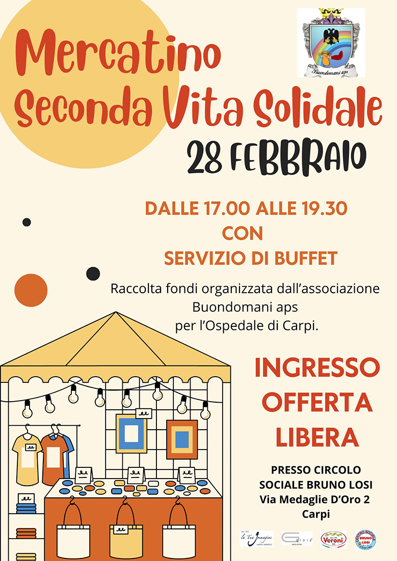 Sabato 28 febbraio, dalle 17 alle 19,30, l’associazione Buondomani Aps per l’Ospedale di Carpi organizza il Mercatino seconda via solidale, con un servizio di buffet, presso il Circolo Bruno Losi di via Medaglie d’Oro, 2. In vendita abbigliamento, articoli per la casa, accessori e oggi vari. I proventi verranno utilizzati per acquistare attrezzature per il Ramazzini. L’ingresso è a offerta libera.
