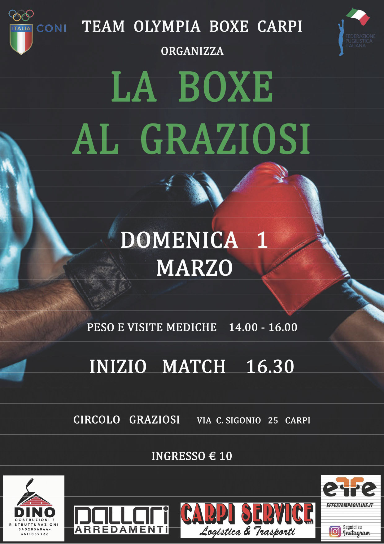 Tra i portacolori del Team Olympia a salire sul ring saranno: Mattia Bozzi (Categoria Elite, 65 kg) combatterà con Cristian Purpura dello Spartan Adamas Lombardia, Giorgia Carpentieri (Categoria Under 17, 52 kg) incontrerà Greta Magnani della asd Italica Boxe, Fadi Taha (Categoria Under 17, 60 kg) affronterà Cristian Leo della Gordini Ravenna, Alessio Sciolti (Categoria Under 19, 80 kg) se la vedrà con Erik Mezzogori della Boxe Riviera del Brenta, Andrea Inglese (Elite, 55 kg) avrà di fronte Mattia Picchi della Gordini Ravenna e, infine, Suleman Shahbaz (Elite, 70 kg) incontrerà Alessandro Cafaro della asd Campogalliano.