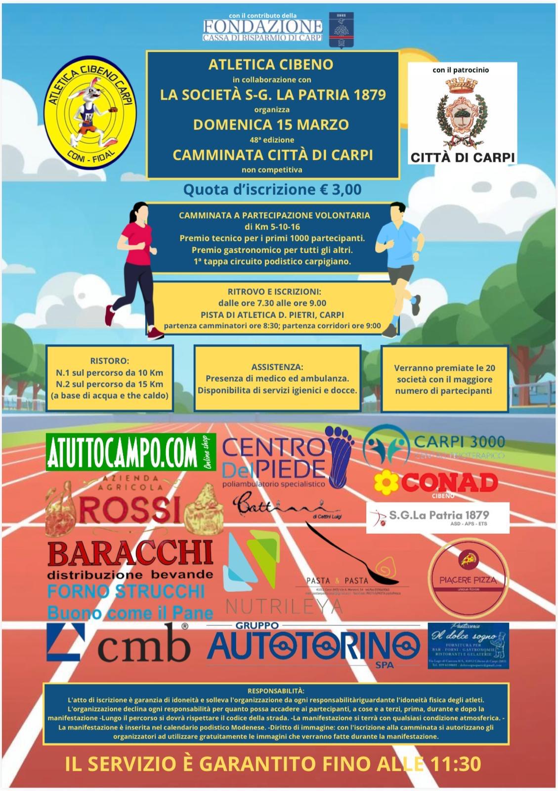 La prima corsa del 2026 è la Camminata Città di Carpi, organizzata dall’Atletica Cibeno, in programma domenica 15 marzo, con partenza dalla pista d’atletica Dorando Pietri, alle 8.30 per i camminatori e alle 9 per chi corre. Tre i percorsi proposti da 5, 10 e 16 chilometri. Ci si iscrive dalle 7.30 direttamente alla pista, al prezzo di 3 euro. La quota comprende un pacco gara e il ristoro finale per tutti i partecipanti.