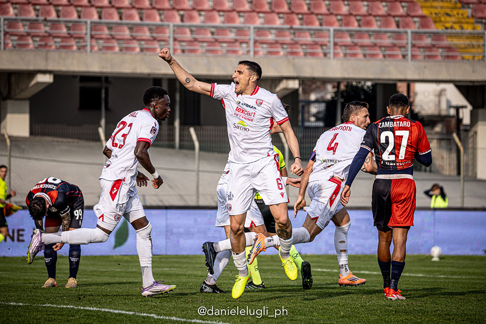 Nel primo tempo sono gli ospiti a partire meglio, gestendo il possesso e recuperando molti palloni nella metà campo biancorossa. La prima occasione importante arriva al 19′: su punizione di Mastinu, una deviazione involontaria di Rigo rischia di sorprendere Sorzi, bravo a togliere il pallone dall’incrocio dei pali. I sardi insistono e si rendono pericolosi ancora con Liviero e Di Stefano, mentre il Carpi cresce nel finale di frazione. Al 44′ Pietra sfiora il vantaggio colpendo la traversa dopo un contrasto vinto con Baldi.