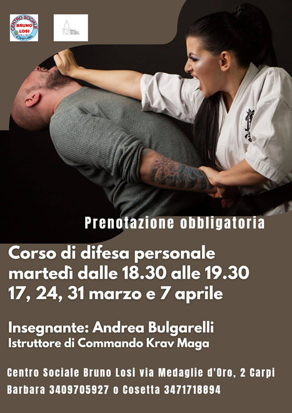 Le quattro lezioni, tenute dall’istruttore di Krav Maga Andrea Bulgarelli, avranno come obiettivo primario quello di insegnare ai partecipanti alcune semplici ma efficaci mosse da adottare in caso di aggressione. Il corso si terrà presso il centro sociale Bruno Losi di via Medaglie d’oro, il 17, 24, 31 marzo e 7 aprile, dalle 18,30 alle 19,30.