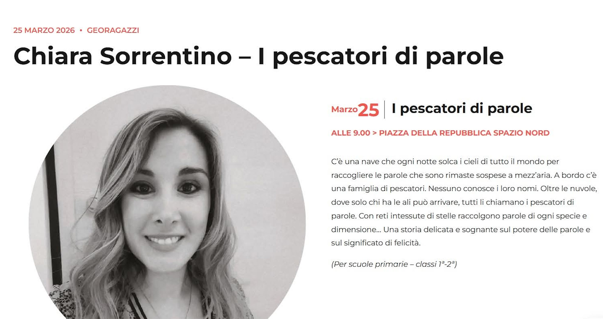 Da Carpi a Monfalcone. C’è una nave che solca i cieli per raccogliere parole sospese e, questa volta, farà tappa in uno dei porti culturali più prestigiosi del Nord-Est. La scrittrice carpigiana Chiara Sorrentino, firma amata della narrativa per l’infanzia, parteciperà alla settima edizione di Geografie, il prestigioso festival letterario di Monfalcone che dal 25 al 29 marzo trasformerà la città della cantieristica in un crocevia di idee e grandi firme. L’appuntamento è fissato per la giornata inaugurale, mercoledì 25 marzo. Nella suggestiva cornice di Piazza della Repubblica (Spazio Nord), a partire dalle ore 9:00, Chiara Sorrentino incontrerà gli alunni delle classi prime e seconde della scuola primaria. Il cuore del laboratorio sarà uno dei suoi albi illustrati di maggior successo, I pescatori di parole (edito da Sassi), una storia poetica e sognante che insegna ai più piccoli il valore della gentilezza e il peso delle espressioni che scegliamo di usare ogni giorno. La partecipazione di Chiara Sorrentino a Monfalcone non è solo un riconoscimento alla sua produzione letteraria, ma la inserisce in un contesto di altissimo profilo. Il festival Geografie, organizzato in collaborazione con la Fondazione Pordenonelegge, è un punto di riferimento nazionale capace di attrarre i nomi più influenti del giornalismo, della scienza e della letteratura.