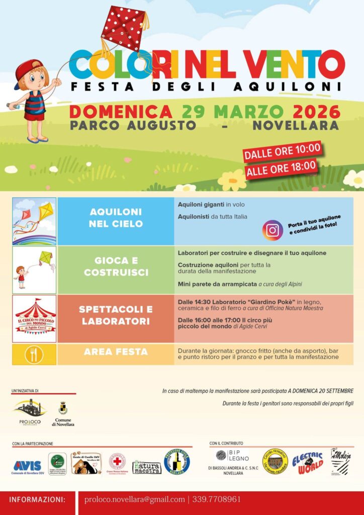 Domenica 29 Marzo 2026 dalle 10,00 alle 18,00 al Parco Augusto di Novellara torna la Festa degli Aquiloni, una giornata dedicata a famiglie, bambini e a chiunque voglia trascorrere del tempo all’aria aperta tra gioco, creatività e condivisione. Durante la giornata potrete ammirare spettacolari aquiloni di ogni forma e dimensione portati in volo da aquilonisti provenienti da tutta Italia, pronti a condividere la loro passione con il pubblico. Laboratori creativi per bambini per costruire e decorare il proprio aquilone. Animazioni e spettacoli dedicati ai più piccoli. Punto ristoro e bar attivi per tutta la giornata. Un’occasione speciale per stare insieme, respirare la primavera e riscoprire la magia delle cose semplici: un prato, il vento e un aquilone che vola nel cielo.