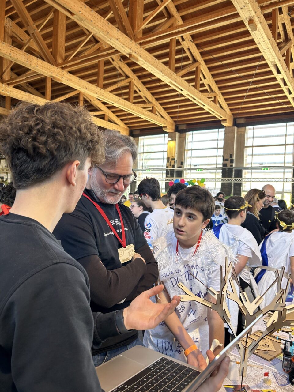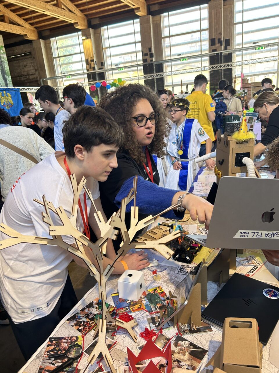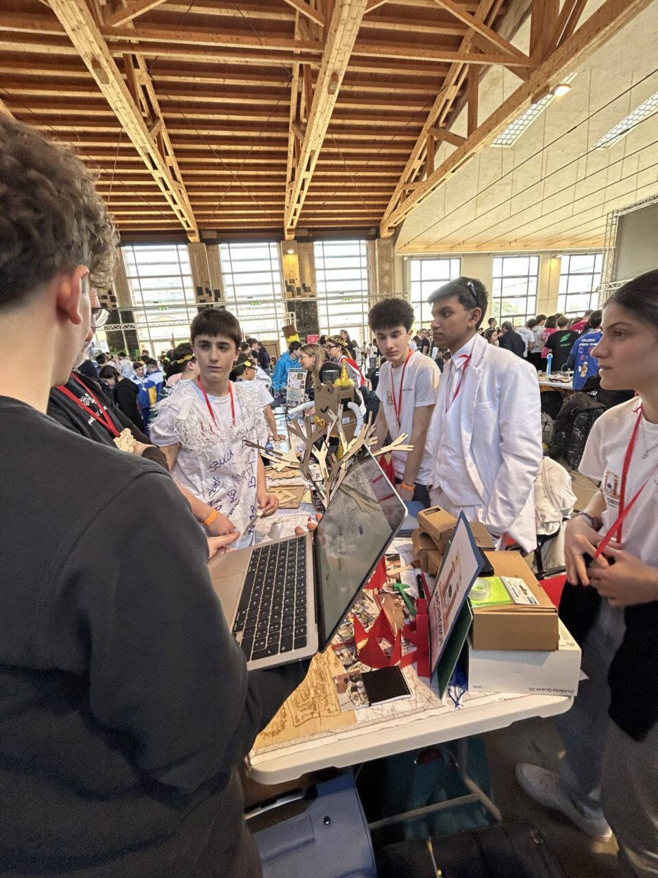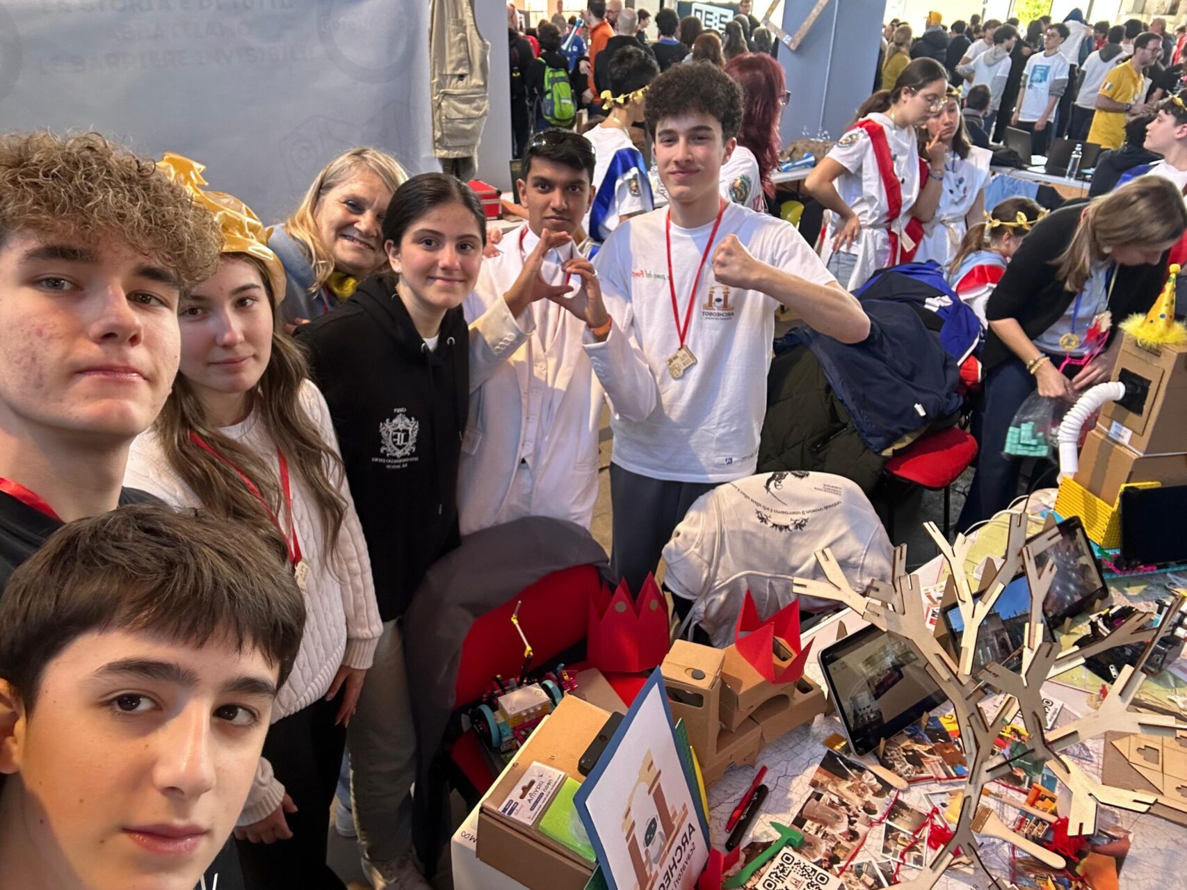 Tra queste, il team ARCHEOBOT Gli scavatori del futuro del Liceo Manfredo Fanti di Carpi, composto da dieci studenti, tre tutor e due coach. A rappresentare il gruppo c’erano Aurora, Federico, Gurman, Riccardo, Andres e Maya, accompagnati dalla Prof. Roberta Righi. Fin dall’inizio, l’atmosfera è stata quella di una vera festa: stand colorati, musica, gadget scambiati tra i partecipanti e un’energia condivisa che ha trasformato la competizione in un’opportunità di incontro e crescita. Tra una presentazione e l’altra, gli studenti hanno avuto la possibilità di incontrare coetanei provenienti da tutta Italia, discutere di progetti, scambiarsi contatti e stringere nuove amicizie.