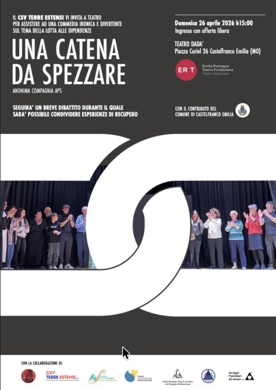 “Una catena da spezzare” è un evento teatrale e formativo dedicato al tema della dipendenza e delle dinamiche familiari disfunzionali, in programma domenica 26 aprile alle 15 presso il Teatro Dadà di Castelfranco Emilia. L’iniziativa nasce dalla collaborazione tra Alcolisti Anonimi (A.A.), Al-Anon, ACA-Italia APS, Anonima Compagnia APS, il Centro Servizi per il Volontariato Terre Estensi e il Centro per le Famiglie dell’Unione del Sorbara, con il coinvolgimento delle realtà associative e istituzionali del territorio, nell’ambito del percorso di Modena Capitale Italiana del Volontariato 2026. Attraverso il linguaggio del teatro, lo spettacolo propone uno sguardo ironico e al tempo stesso profondo sulle fragilità che possono emergere quando la dipendenza e la disfunzione entrano nella vita delle persone e delle famiglie, generando silenzi, difficoltà relazionali e sofferenze spesso invisibili. La partecipazione è gratuita. È prevista la possibilità di lasciare un’offerta libera a sostegno della compagnia teatrale.