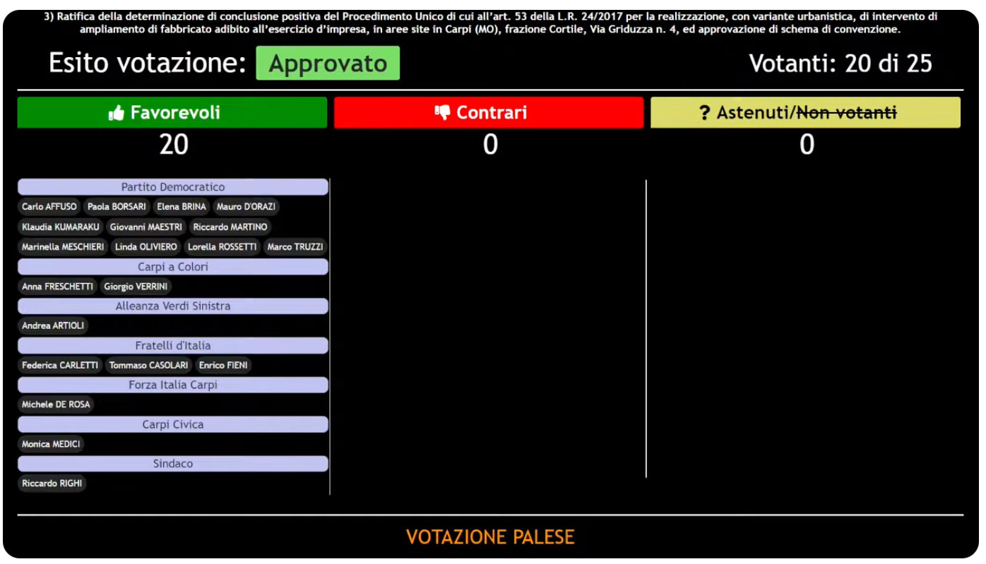 L’unica stoccatina è arrivata dalla consigliera Monica Medici (Carpi Civica) “non nel merito – precisa – bensì nell’iter procedurale che un intervento così modesto ha dovuto affrontare. Questa è la prima volta che vediamo in funzione il nuovo Pug: ci sono voluti quattro incontri in Conferenza dei servizi e si sono spesi tempo e denari pubblici e privati in una misura del tutto esagerata per 200 mq, forse qualcosa nel Piano urbanistico generale non è stato ben valutato e dovrebbe essere ripensato. A proposito di impatto ambientale, sarebbe alquanto opportuno guardare invece a via Tre Ponti dove stanno sorgendo 130 appartamenti, procedimento di cui noi non abbiamo visto nulla”.