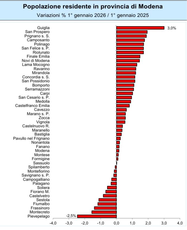 I comuni, invece, che rispetto al 1° gennaio 2025, evidenziano una crescita demografica sono: i comuni di pianura di San Prospero (+1,9%), Camposanto (+1,8%), San Felice s.P. (+1,7%), Finale E. e Novi di Modena (+1,5%), Concordia s.S., Mirandola e San Possidonio (+1,2%), Medolla (+0,9%) e Cavezzo (+0,6%); i comuni dell’area Metropolitana di Ravarino (+1,2%), Bomporto (+1,1%), Carpi e San Cesario s.P. (+1,0%), Castelfranco E. (+0,8%) e Vignola (+0,5%); i comuni collinari e montani di Guiglia (+3,0%), Prignano s.S (+1,9%), Polinago e Riolunato (+1,7%), Lama Mocogno (+1,3%), Serramazzoni (+1,1%), Zocca e Marano s.P. (+0,6%).