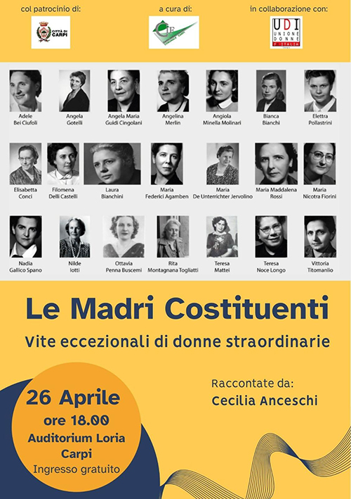 E, domenica 26 aprile, le iniziative si concluderanno con la Pedalata della Staffetta, aperta a tutti, con partenza alle 15 da Piazza Martiri, un percorso nei luoghi della memoria cittadina a cura di Anpi Carpi, e alle 18, all’Auditorium Loria, con l’evento Le Madri Costituenti, dedicato alle figure femminili che hanno contribuito alla nascita della Repubblica, raccontate da Cecilia Anceschi, a cura di Cif-Centro Italiano Femminile, in collaborazione con Udi-Unione Donne In Italia.