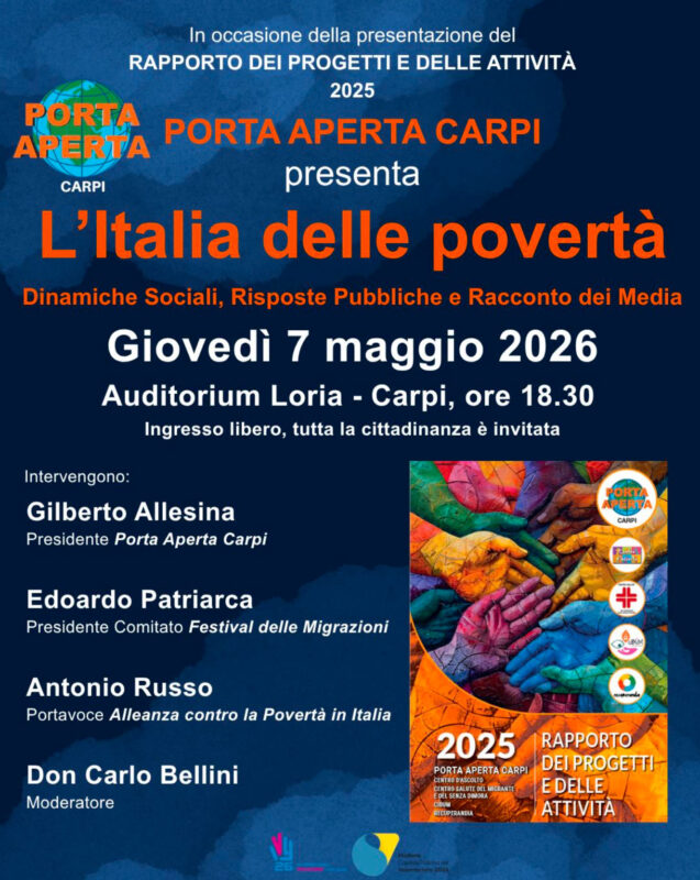 Porta Aperta Carpi organizza giovedì 7 maggio, alle ore 18,30, presso l’Auditorium Loria, L’Italia delle povertà - Dinamiche Sociali, risposte pubbliche e Racconto dei Media. Tra i relatori Antonio Russo, portavoce Alleanza contro la Povertà in Italia, Edoardo Patriarca, presidente Comitato Festival delle Migrazioni e Don Carlo Bellini, moderatore.